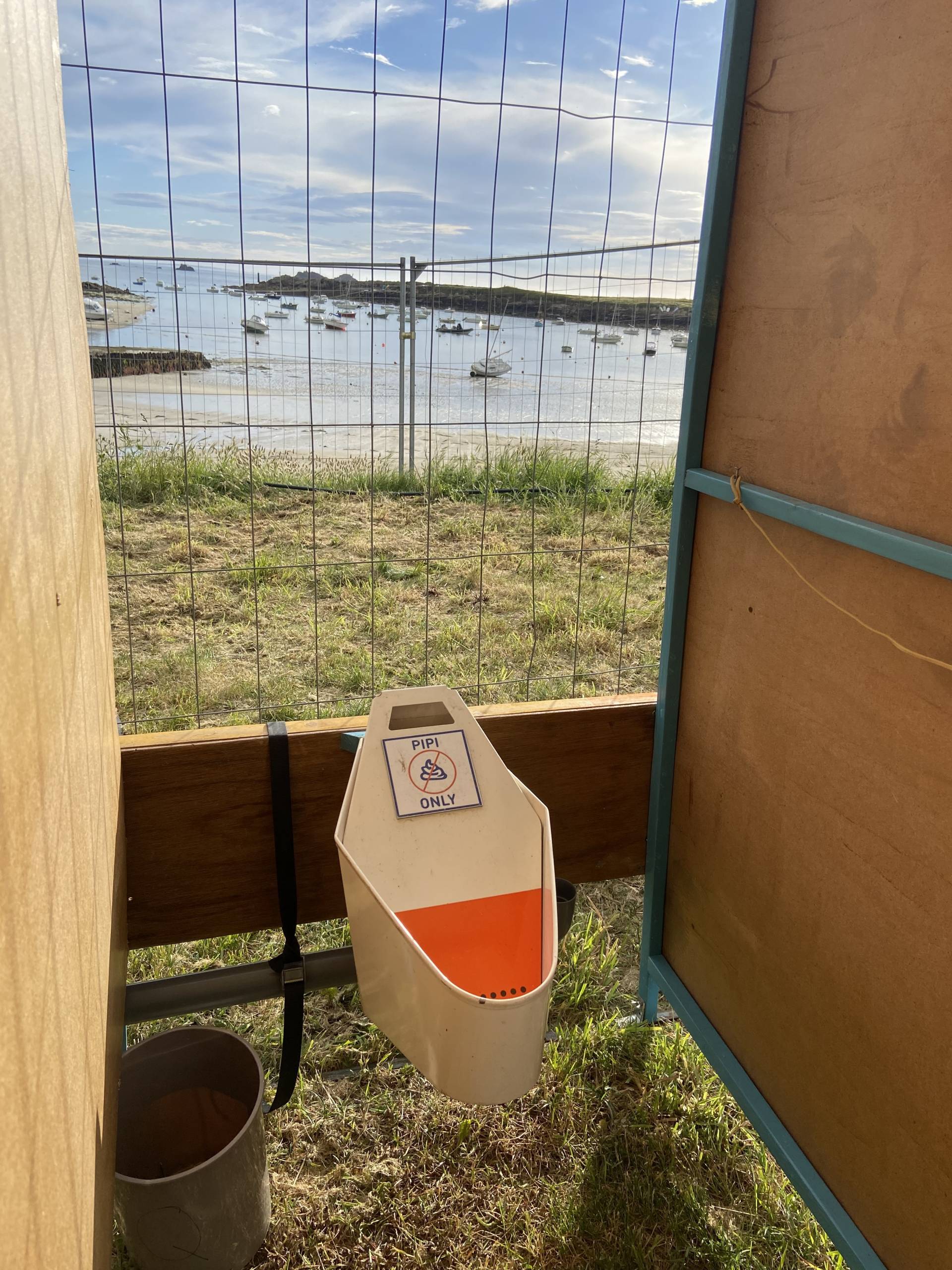 Une gouttière est placée sur la partie avant de l’orifice du toilette et permet de recueillir l’urine aussi bien des filles que des garçons (à conditions que ces derniers fassent pipi assis !)